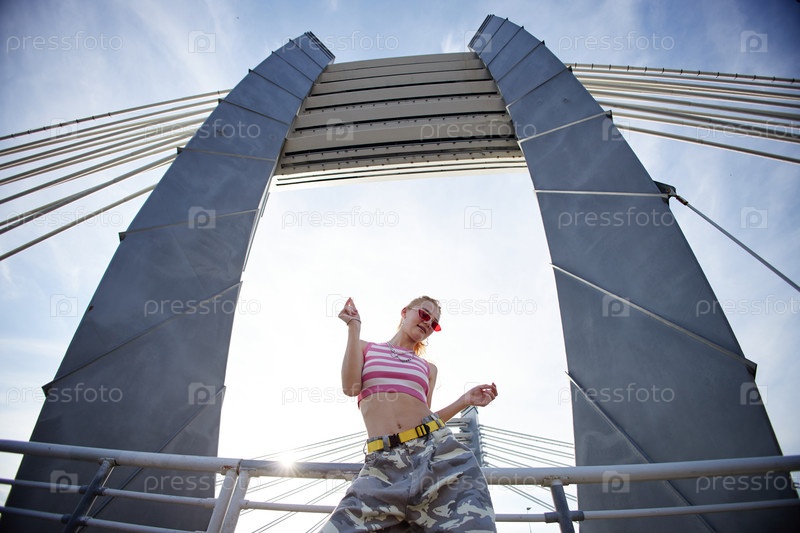 Gen Z Girl танцует на открытом воздухе на современном городском мосту