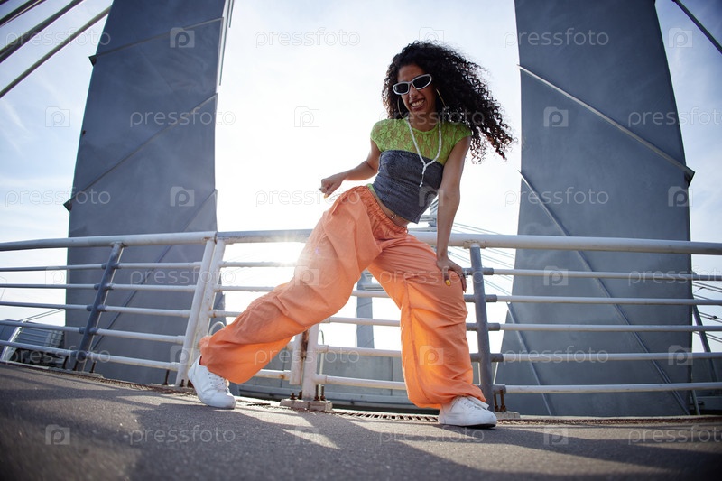 Молодая взрослая женщина танцует на улице на городском мосту в солнечную погоду