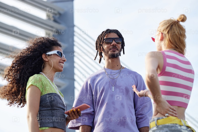 Мультиэтнические друзья поколения Z общаются на свежем воздухе и участвуют в разговоре