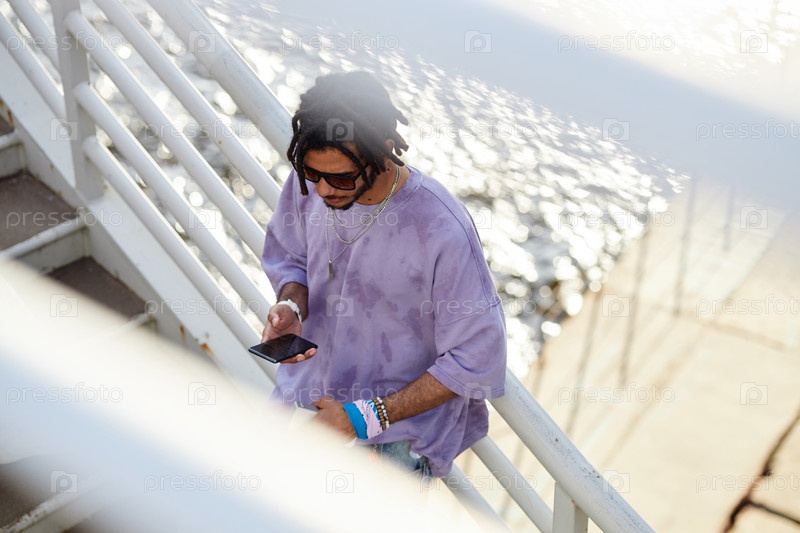 Молодой человек ходит на открытом воздухе, используя смартфон возле воды