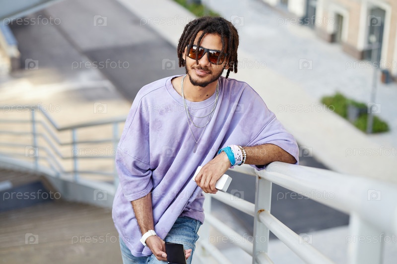 Портрет молодого взрослого мужчины в солнцезащитных очках, опирающегося на перила на открытом воздухе
