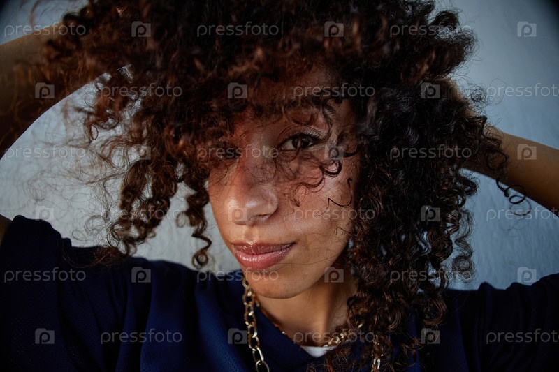 Портрет молодой взрослой мультиэтнической женщины, касающейся кудрявых волос и улыбающейся