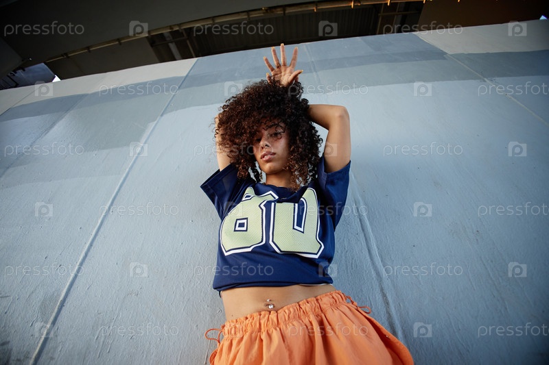 Мультиэтническая девушка уверенно позирует против городской стены на открытом воздухе