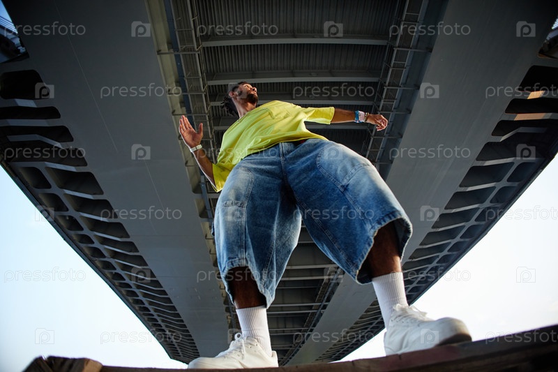 Молодой взрослый мужчина танцует под мостом, выражая городскую культуру Gen Z