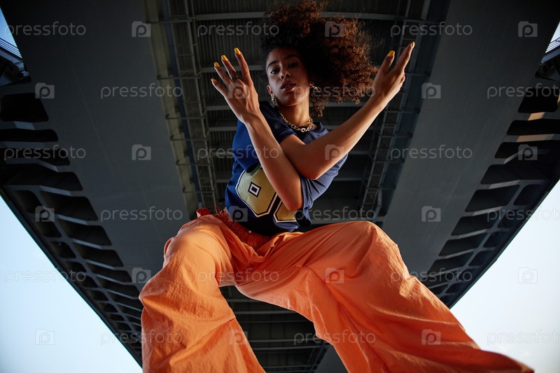 Мультиэтническая девушка танцует энергично под городской мостовой структурой