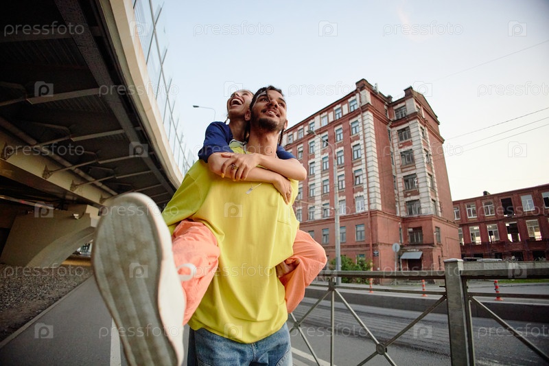 Мультиэтническая супружеская пара Gen Z смеется на улице во время прогулки по городу