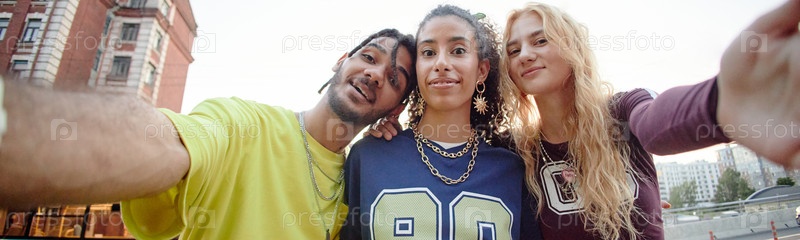 Различные люди из поколения Z делают селфи на открытом воздухе и улыбаются перед камерой