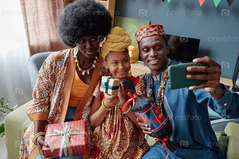 Черная семья празднует Кванзаа и делает селфи, обмениваясь подарками