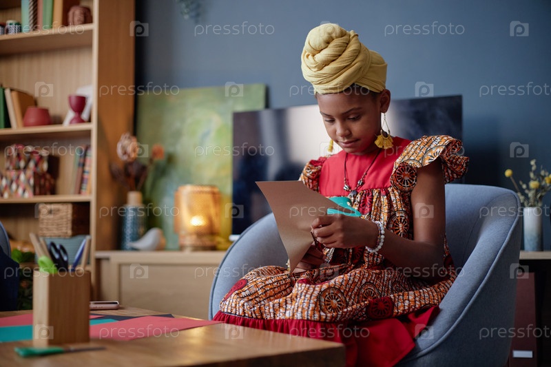 Черная девушка создает ручные украшения Кванза, сидя в помещении