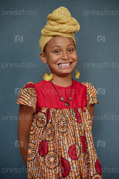 Портрет улыбающейся чернокожей девушки, празднующей Кванзаа на синем фоне