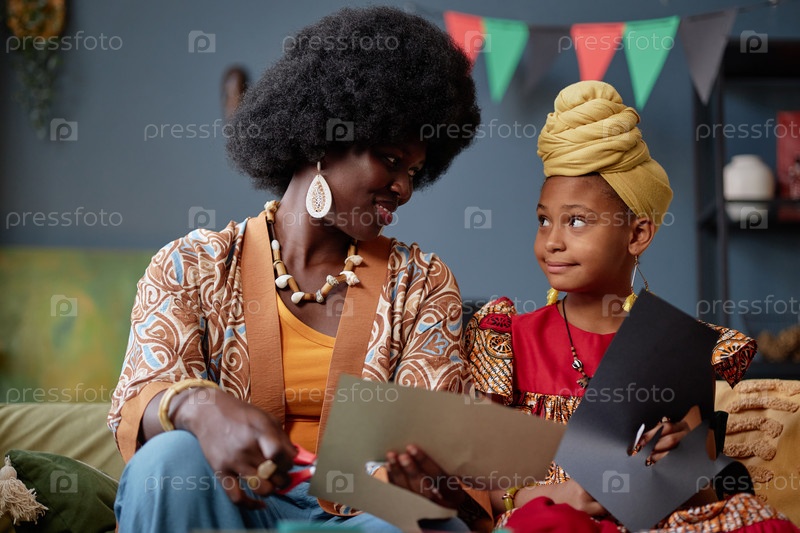 Чернокожая женщина и черная девушка создают Kwanzaa Crafts вместе в помещении, улыбаясь