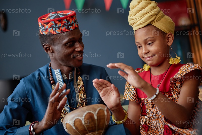 Черный мужчина и черная девушка празднуют Кванза, играя на традиционных барабанах