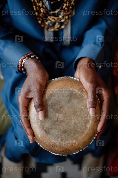 Взрослый чернокожий мужчина держит традиционный барабан, празднуя Кванзаю в помещении