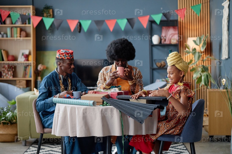 Черная семья празднует Кванзаю, делясь подарками и наслаждаясь торжественным собранием