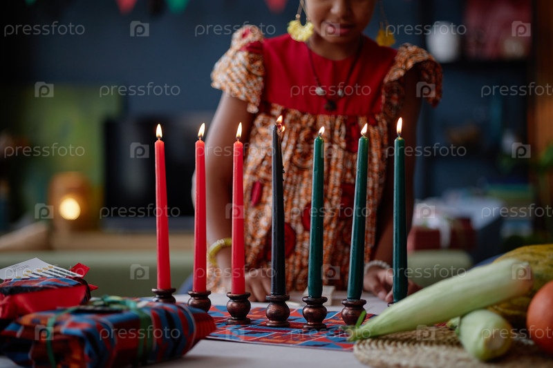 Черная девушка празднует Кванзаа, освещая свечи Кинара во время праздничного ритуала