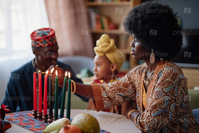 Черная женщина зажигает свечи Кинара с семьей, наблюдающей традицию Кванзаа