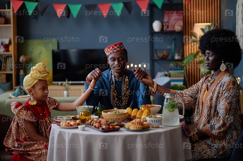 Черная семья празднует Кванзау, держась за руки вокруг торжественного обеденного стола