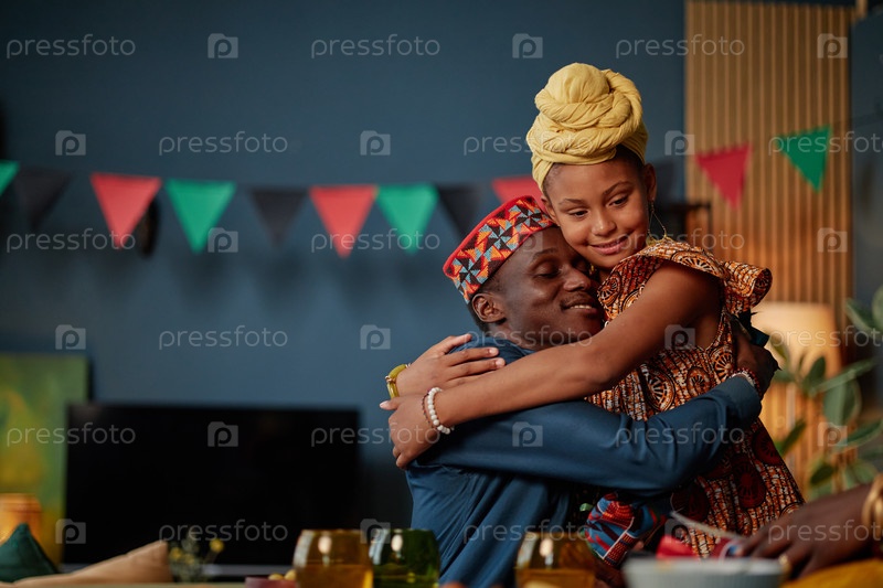 Молодой чернокожий мужчина обнимает молодую черную девушку во время празднования Кванзаа в помещении