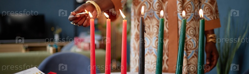 Заголовок чернокожей женщины, освещающей свечи Kwanzaa Kinara во время праздничного ритуала