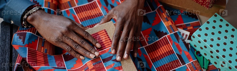 Заголовок чернокожей женщины, упаковавшей подарочную коробку с узором бумаги в честь празднования Кванзаа