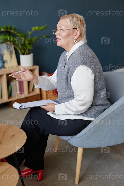 Женщина объясняет во время консультационной сессии в помещении