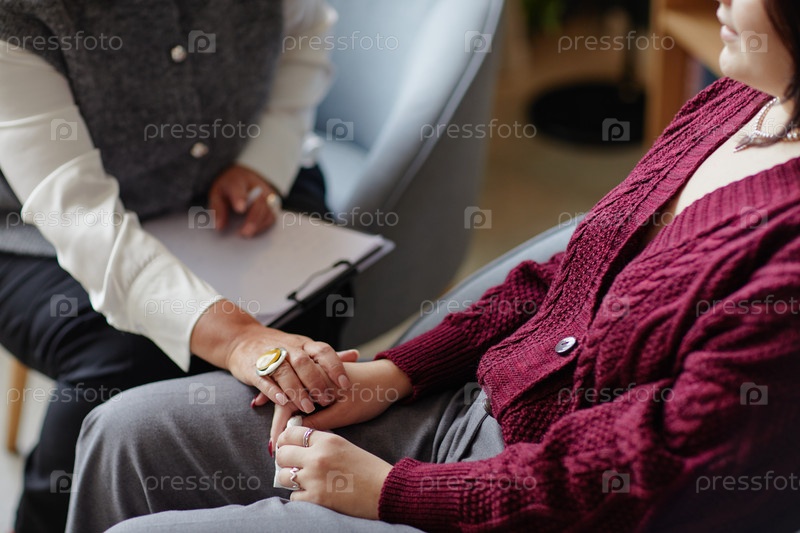 Женщина успокаивает молодую взрослую женщину во время сеанса