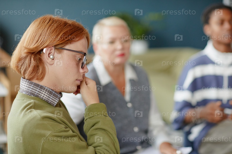 Молодой человек с слуховым аппаратом посещает групповое консультирование