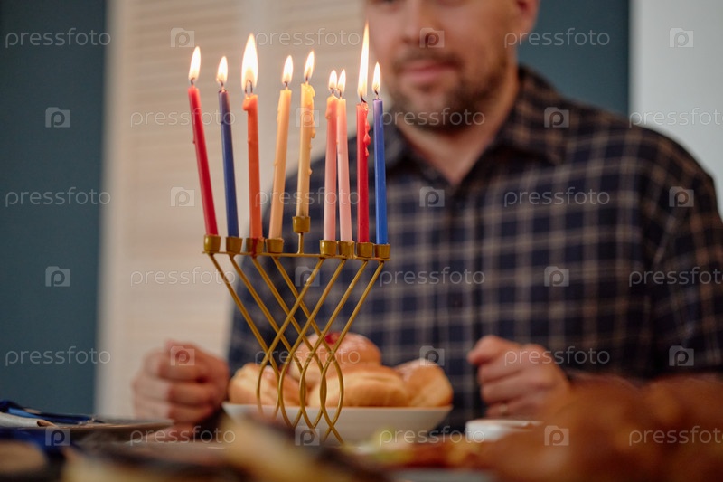 Мужчина среднего возраста празднует Хануку, зажигая свечи менора