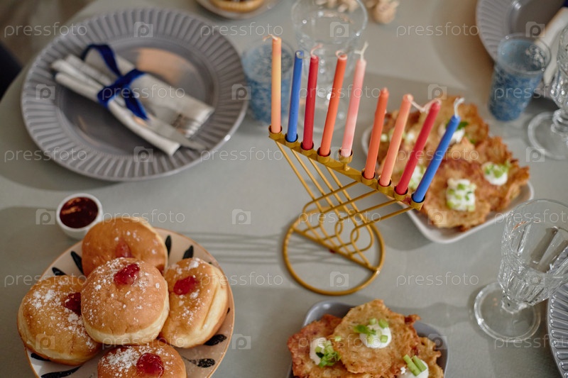 Ханука менора с зажженными свечами в окружении традиционной праздничной еды