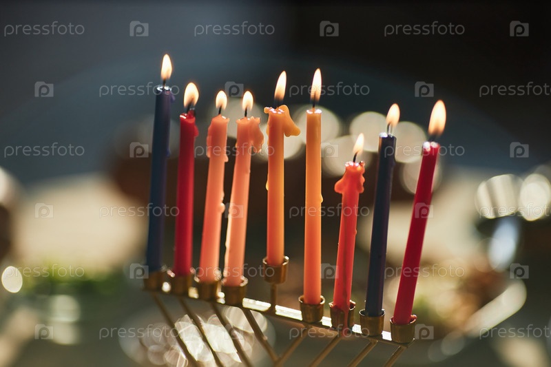 Красочные свечи Хануки горят в меноре, отмечающей еврейский праздник