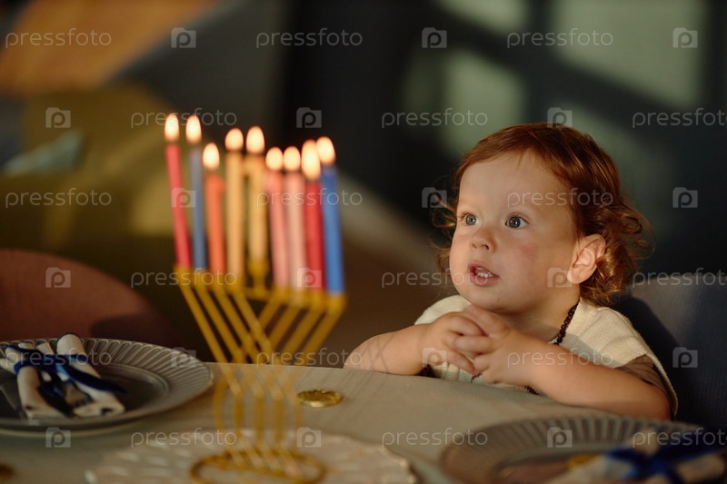 Ребенок смотрит, как горят свечи меноры во время празднования Хануки