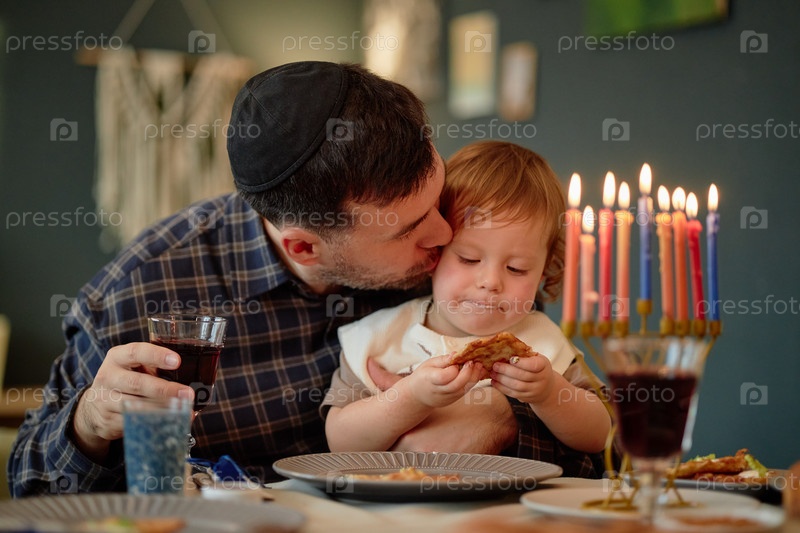 Молодой взрослый мужчина целует ребенка, ест пищу во время празднования Хануки