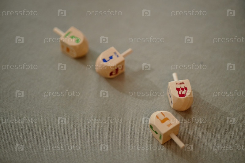 Деревянные дрейдели вращаются на столе, празднуя традицию Ханукки