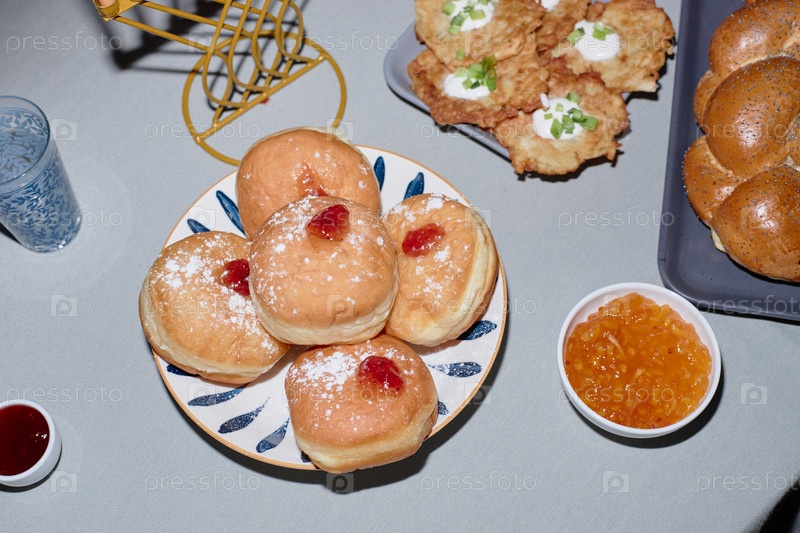 Таблица Хануки с желевыми пончиками и картофельными блинами с набивкой