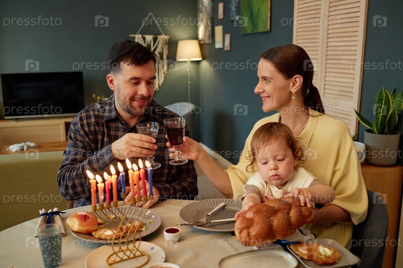 Семья празднует Хануку, освещая менору и делясь хлебом Challah