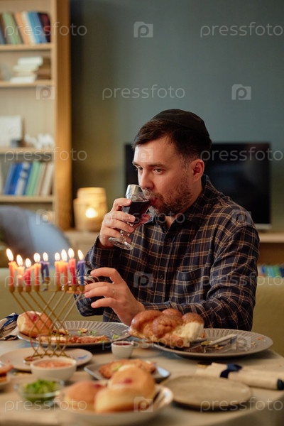 Молодой взрослый мужчина пьет вино во время празднования обеда Хануки