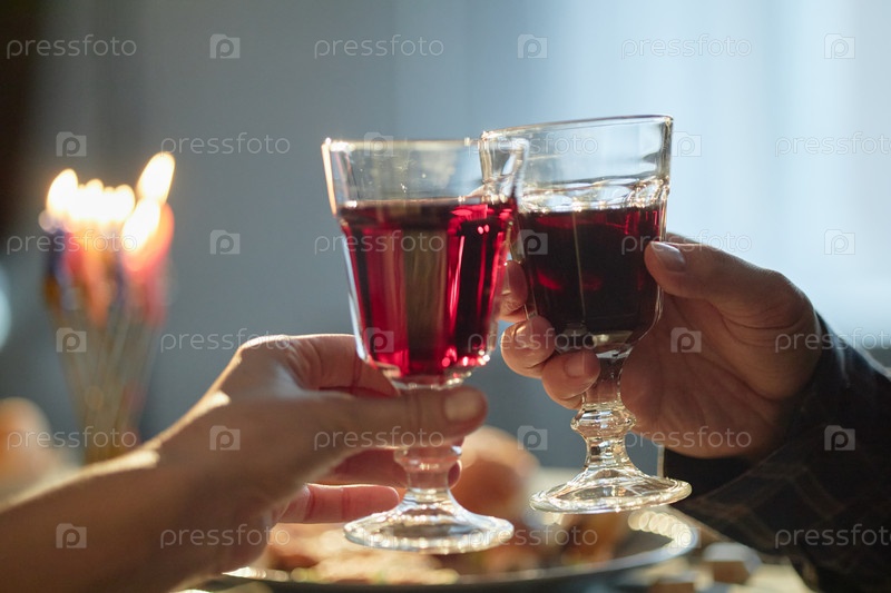 Руки взрослых хлопают бокалами с вином, празднуя Хануку вместе