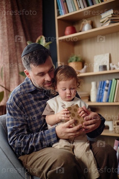 Отец помогает маленькому ребенку открывать подарочный ящик во время празднования Хануки