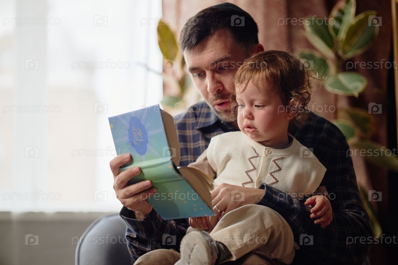 Молодой взрослый мужчина читает книжку рассказов Хануки любознательному малышу-мальчику