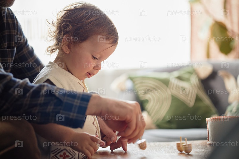 Ребенок играет в дрейдель со взрослым во время празднования Хануки внутри