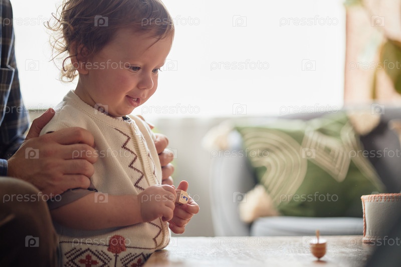 Малыш играет в дрейдел со взрослым во время празднования Хануки внутри