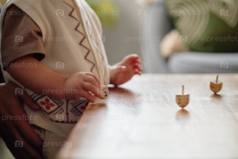 Детские игрушки Dreidel, вращающиеся на столе во время празднования Хануки