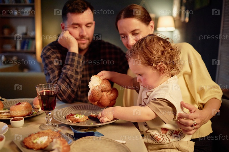 Молодые родители смотрят, как малыш ест традиционный ужин Хануки
