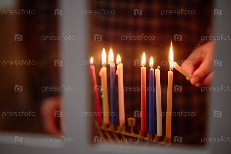 Взрослые руками зажигают свечи Хануки во время еврейского фестиваля