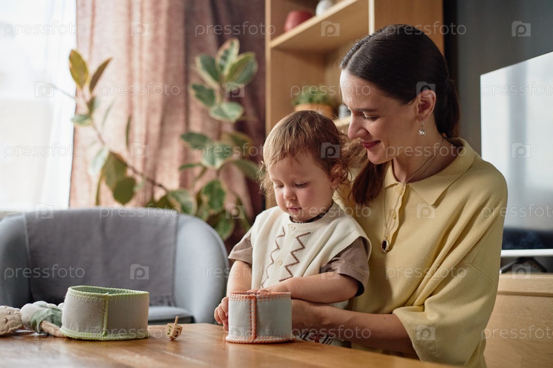 Молодая мать помогает малышу-ребенку играть с игрушкой Hanukkah Dreidel