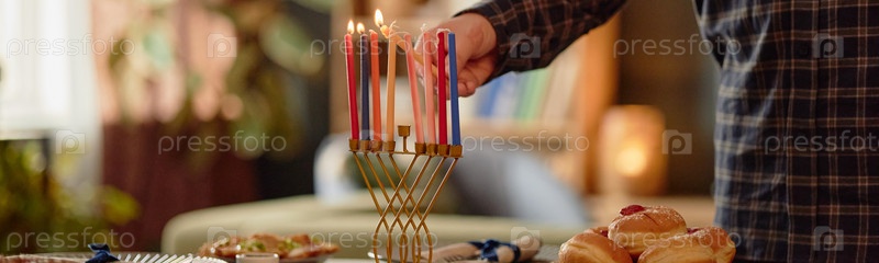 Мужчина устраивает красочные свечи на меноре для Хануки