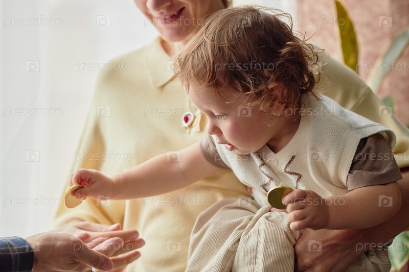 Женщина помогает маленькому ребенку, давая шоколадные монеты во время празднования Хануки