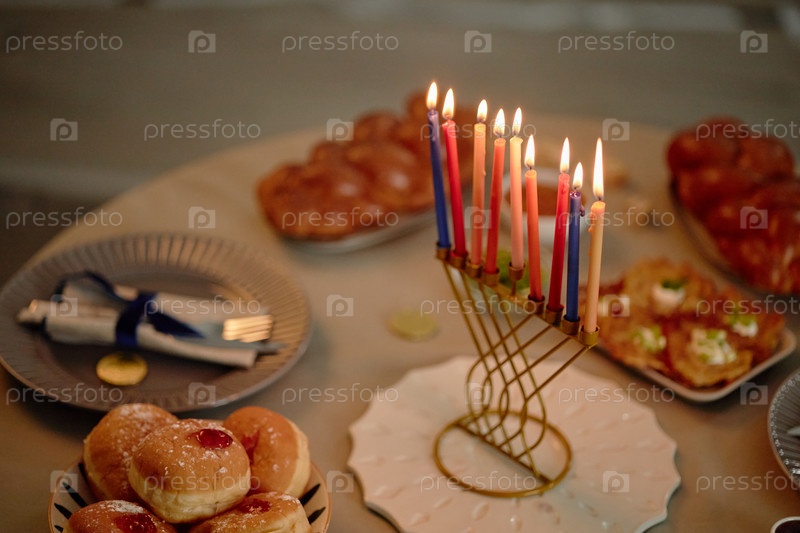 Ханука Менора с зажженными свечами, освещающими традиционные праздничные сладости