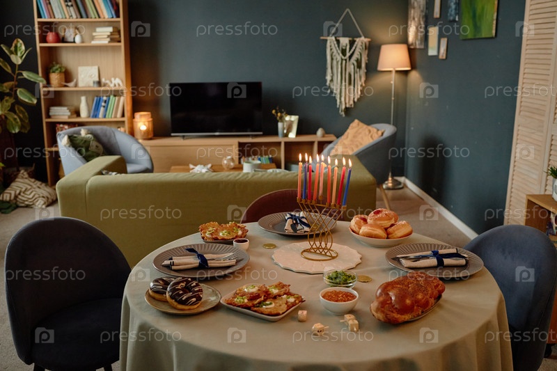 Настройка стола Хануки, на которой отображается традиционная еда и зажжены свечи менора