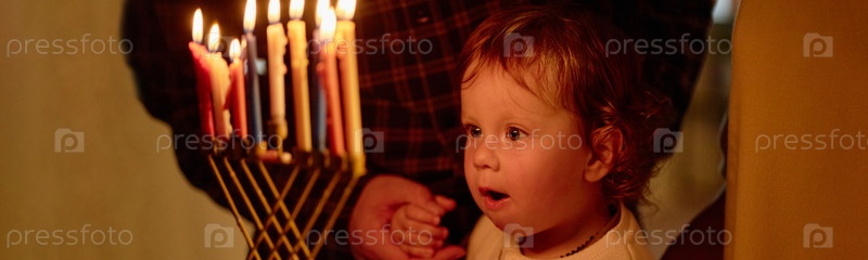 Детский взгляд на свечи меноры во время празднования Хануки в помещении